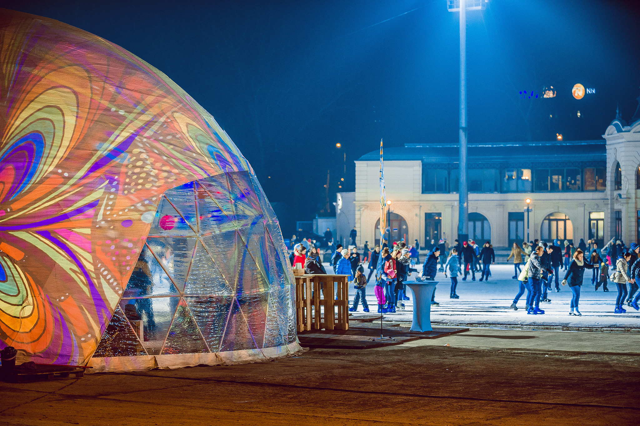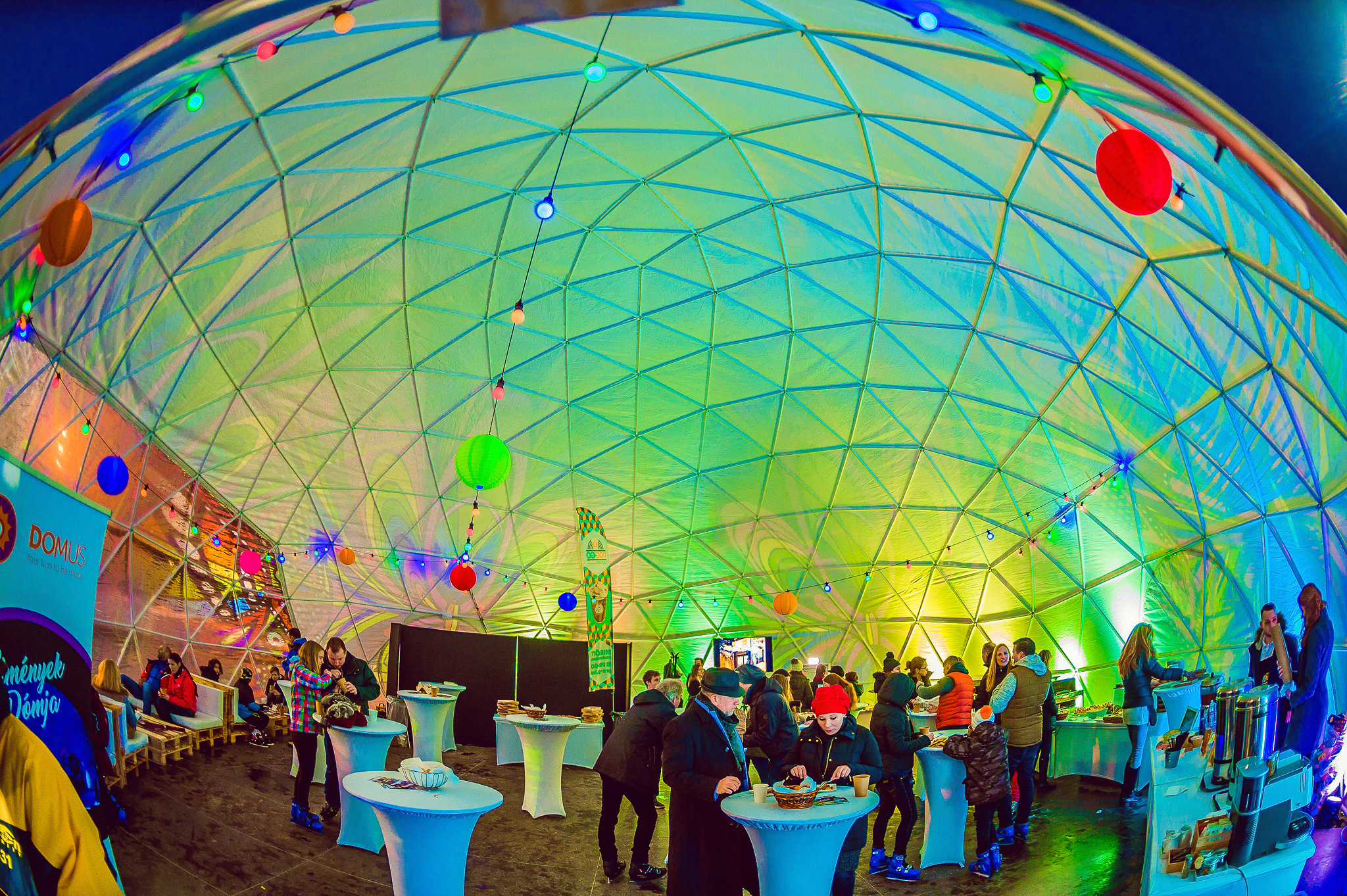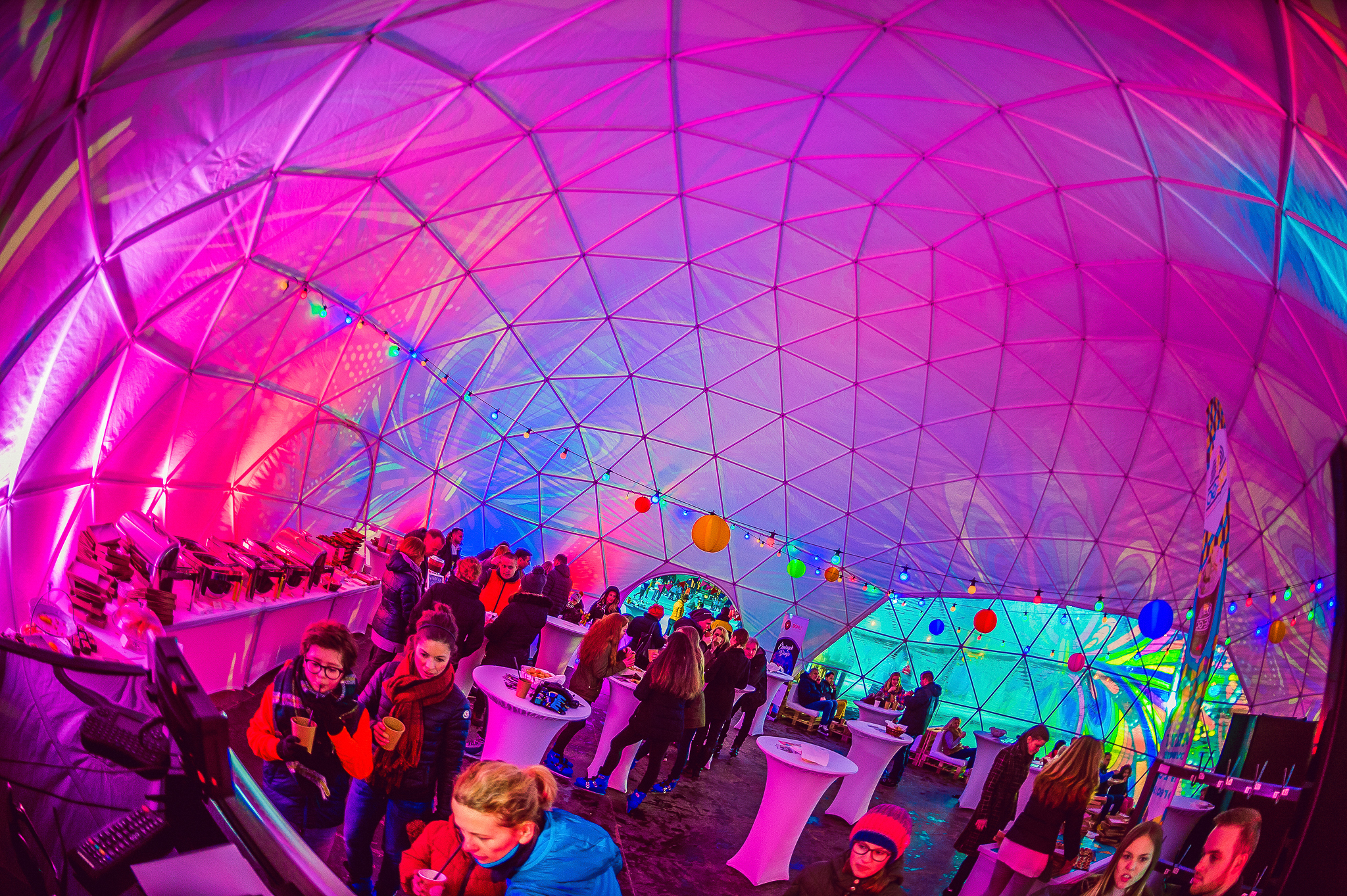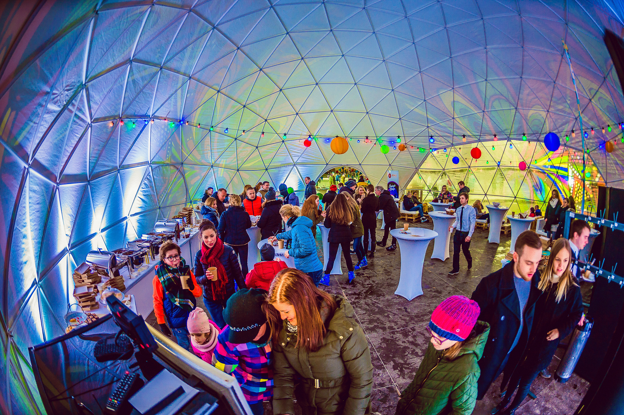 Ilyen gyönyörű volt a Városligeti Műjégpályánál tartott Városliget Café - Tópart korcsolyázással egybekötött ügyféltalálkozója! A félgömb alakú sátor fényfestéséhez passzoltak az UV színű égősoraink és a rá rímelő színű textil lampionjaink. Vidám színeket varázsoltak a februári télben